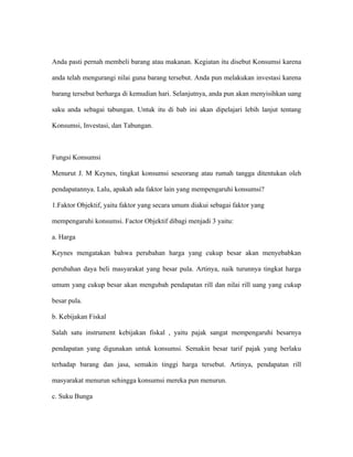 36 Pola konsumsi bergeser dari pola konsumsi yang didominasi kebutuhan survival menuju pengeluaran yang lebih bervariasi. Faktor objektif yaitu faktor yang secara umum diakui sebagai faktor yang mempengaruhi konsumsi. Sementara faktor yang mempengaruhi kegiatan konsumsi diantaranya.